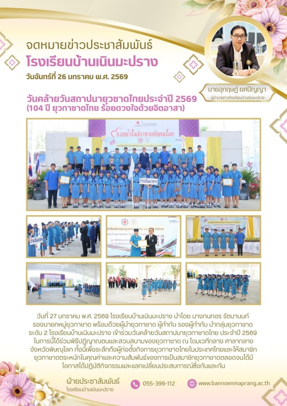 วันที่ 27 มกราคม พ.ศ. 2569 โรงเรียนบ้านเนินมะปราง นำโดย นางกนกอร รัตนานนท์ รองนายกหมู่ยุวกาชาด พร้อมด้วยผู้นำยุวกาชาด ผู้กำกับ รองผู้กำกับ นำกลุ่มยุวกาชาด ระดับ 2 โรงเรียนบ้านเนินมะปราง เข้าร่วมวันคล้ายวันสถาปนายุวกาชาดไทย ประจำปี 2569 ในการนี้ได้ร่วมพิธีปฏิญาณตนและสวนสนามของยุวกาชาด ณ โดมเวทีกลาง ศาลากลางจังหวัดพิษณุโลก ทั้งนี้เพื่อระลึกถึงผู้ก่อตั้งกิจการยุวกาชาดไทยในประเทศไทยและให้สมาชิกยุวกาชาดตระหนักในคุณค่าและความสัมพันธ์ของการเป็นสมาชิกยุวกาชาดตลอดจนได้มีโอกาสได้ปฏิบัติกิจกรรมและแลกเปลี่ยนประสบการณ์ซึ่งกันและกัน