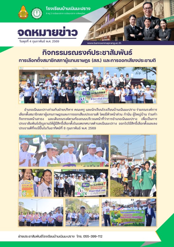 อำเภอเนินมะปรางร่วมกับฝ่ายบริหาร คณะครู และนักเรียนโรงเรียนบ้านเนินมะปราง ร่วมรณรงค์การเลือกตั้งสมาชิกสภาผู้แทนราษฎรและการออกเสียงประชามติ โดยมีหัวหน้าส่วน กำนัน ผู้ใหญ่บ้าน ร่วมทำกิจกรรมหน้าเสาธง และเดินรณรงค์ตามท้องถนนบริเวณหน้าที่ว่าการอำเภอเนินมะปราง เพื่อเป็นการประชาสัมพันธ์เชิญชวนให้ผู้มีสิทธิ์เลือกตั้งในเขตเทศบาลตำบลเนินมะปราง ออกไปใช้สิทธิ์เลือกตั้งและลงประชามติที่จะมีขึ้นในวันอาทิตย์ที่ 8 กุมภาพันธ์ พ.ศ. 2569