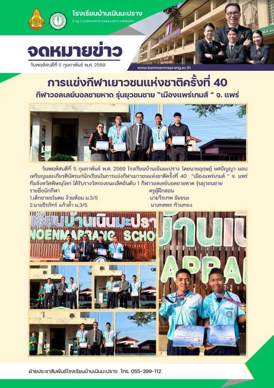 วันพฤหัสบดีที่ 5 กุมภาพันธ์ พ.ศ. 2569 โรงเรียนบ้านเนินมะปราง โดยนายอุฤษฏ์ ยศปัญญา มอบเหรียญและเกียรติบัตรแก่นักเรียนในการแข่งกีฬาเยาวชนแห่งชาติครั้งที่ 40 “เมืองแพร่เกมส์ ” จ. แพร่ ทีมจังหวัดพิษณุโลก ได้รับรางวัลรองชนะเลิศอันดับ 1 กีฬาวอลเลย์บอลชายหาด รุ่นยุวชนชาย