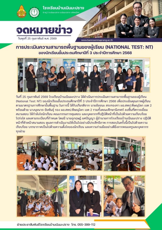วันที่ 25 กุมภาพันธ์ 2569 โรงเรียนบ้านเนินมะปราง ได้ดำเนินการประเมินความสามารถพื้นฐานของผู้เรียน (National Test: NT) ของนักเรียนชั้นประถมศึกษาปีที่ 3 ประจำปีการศึกษา 2568 เพื่อประเมินคุณภาพผู้เรียนตามมาตรฐานการศึกษาขั้นพื้นฐาน ในการนี้ ได้รับเกียรติจาก นายชัยชนะ สระทองทา ผอ.สพป.พิษณุโลก เขต 2 พร้อมด้วย นางนุชนาถ ชัยพันธุ์ รอง ผอ.สพป.พิษณุโลก เขต 2 รวมทั้งคณะศึกษานิเทศก์ ลงพื้นที่ตรวจเยี่ยมสนามสอบ ให้กำลังใจนักเรียน คณะกรรมการคุมสอบ และบุคลากรที่ปฏิบัติหน้าที่เป็นไปด้วยความเรียบร้อย โปร่งใส และตามระเบียบที่กำหนด โดยมี นายอุกฤษฎ์ ยศปัญญา ผู้อำนวยการโรงเรียนบ้านเนินมะปราง ปฏิบัติหน้าที่หัวหน้าสนามสอบ ดูแลการดำเนินงานให้เป็นไปอย่างมีประสิทธิภาพ การสอบในครั้งนี้เป็นไปด้วยความเรียบร้อย บรรยากาศเป็นไปด้วยความตั้งใจของนักเรียน และความร่วมมืออย่างดียิ่งจากคณะครูและบุคลากรทุกฝ่าย |