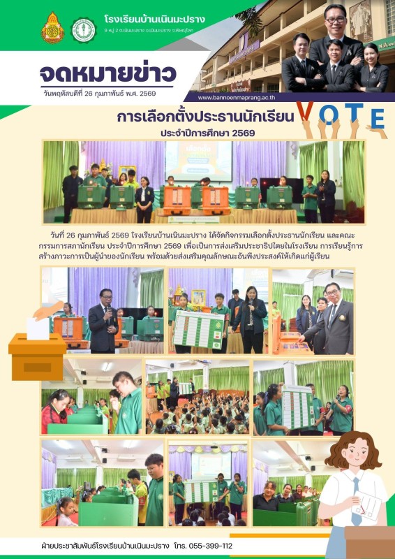 วันที่ 26 กุมภาพันธ์ 2569 โรงเรียนบ้านเนินมะปราง ได้จัดกิจกรรมเลือกตั้งประธานนักเรียน และคณะกรรมการสภานักเรียน ประจำปีการศึกษา 2569 เพื่อเป็นการส่งเสริมประชาธิปไตยในโรงเรียน การเรียนรู้การสร้างภาวะการเป็นผู้นำของนักเรียน พร้อมด้วยส่งเสริมคุณลักษณะอันพึงประสงค์ให้เกิดแก่ผู้เรียน